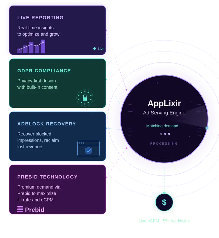 AppLixir handles real-time bidding across 31+ demand partners, global delivery, GDPR consent, and instant reward callbacks. You just watch revenue roll in.