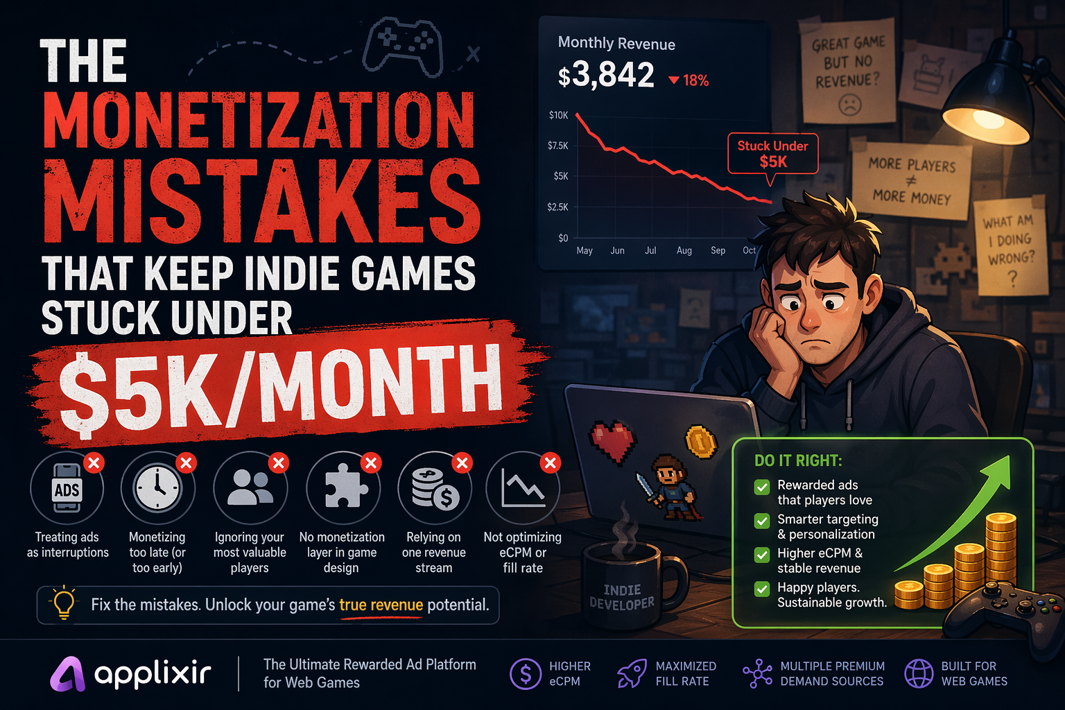 • Games under $5K/month typically under-monetize their most engaged 10% of users. • Opt-in rewarded video ads can generate 3–10x higher engagement than forced interstitials. • The difference between a $5K game and a $50K game is not traffic — it’s how intelligently you monetize player intent. • Six recurring mistakes keep indie games stuck: forced ads, bad timing, ignoring power users, no monetization layer in design, single revenue streams, and no eCPM/fill-rate optimization. |