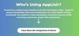 Continuing on “The Ultimate Guide for Unity WebGL Monetization” post, In WebGL games, rewarded video ads are typically integrated using JavaScript SDKs provided by ad networks. Integrating rewarded video ads into Unity WebGL games can be achieved through platforms like AppLixir, which offers a straightforward process: